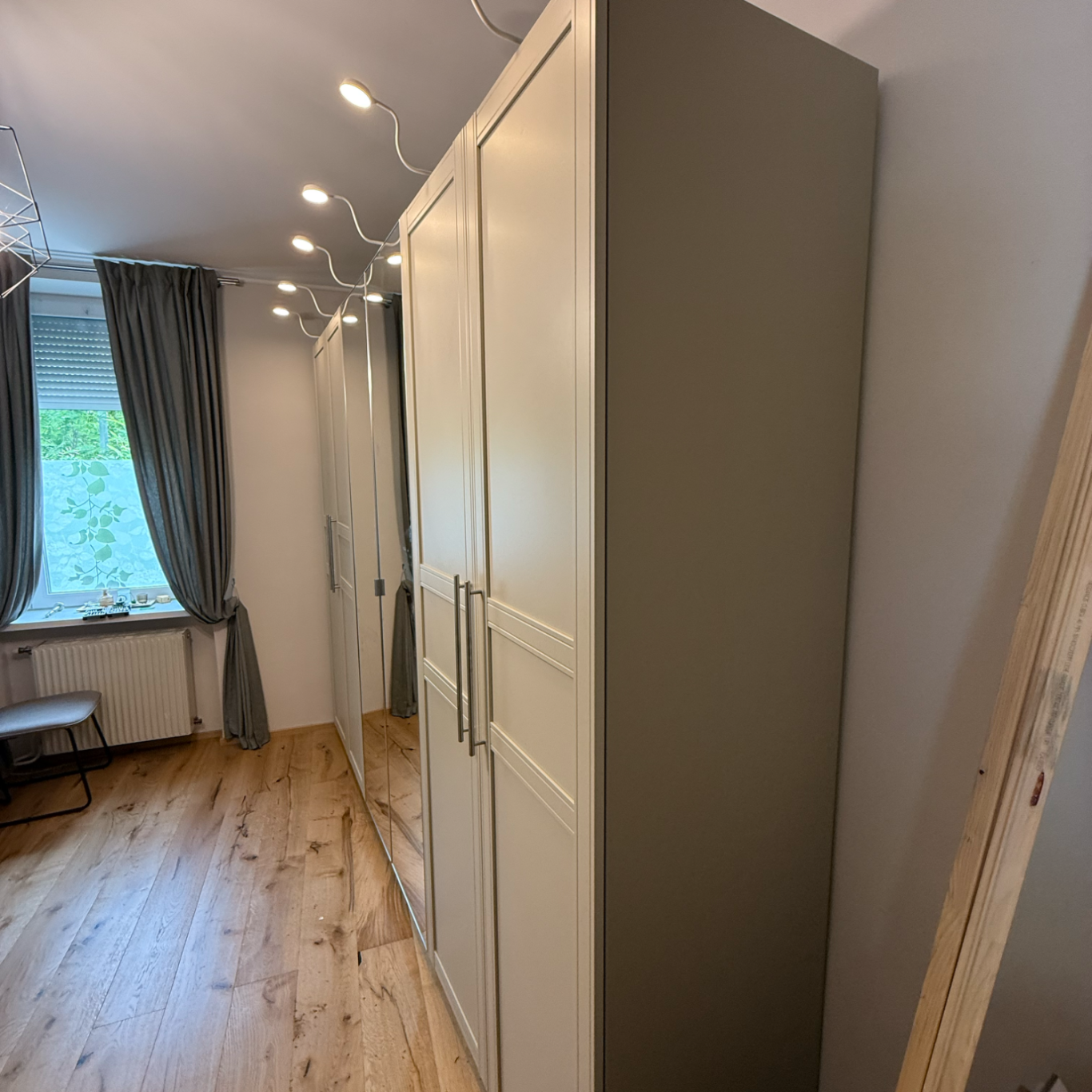 Die Montage umfasste den vollständigen Aufbau der Schrankelemente, die exakte Ausrichtung der Korpusse sowie die präzise Montage der Türen. Besonders bei großen Schranksystemen wie dem IKEA PAX ist eine saubere Planung und genaue Ausführung entscheidend, damit alle Elemente korrekt ausgerichtet sind und sich die Türen einwandfrei öffnen und schließen lassen.