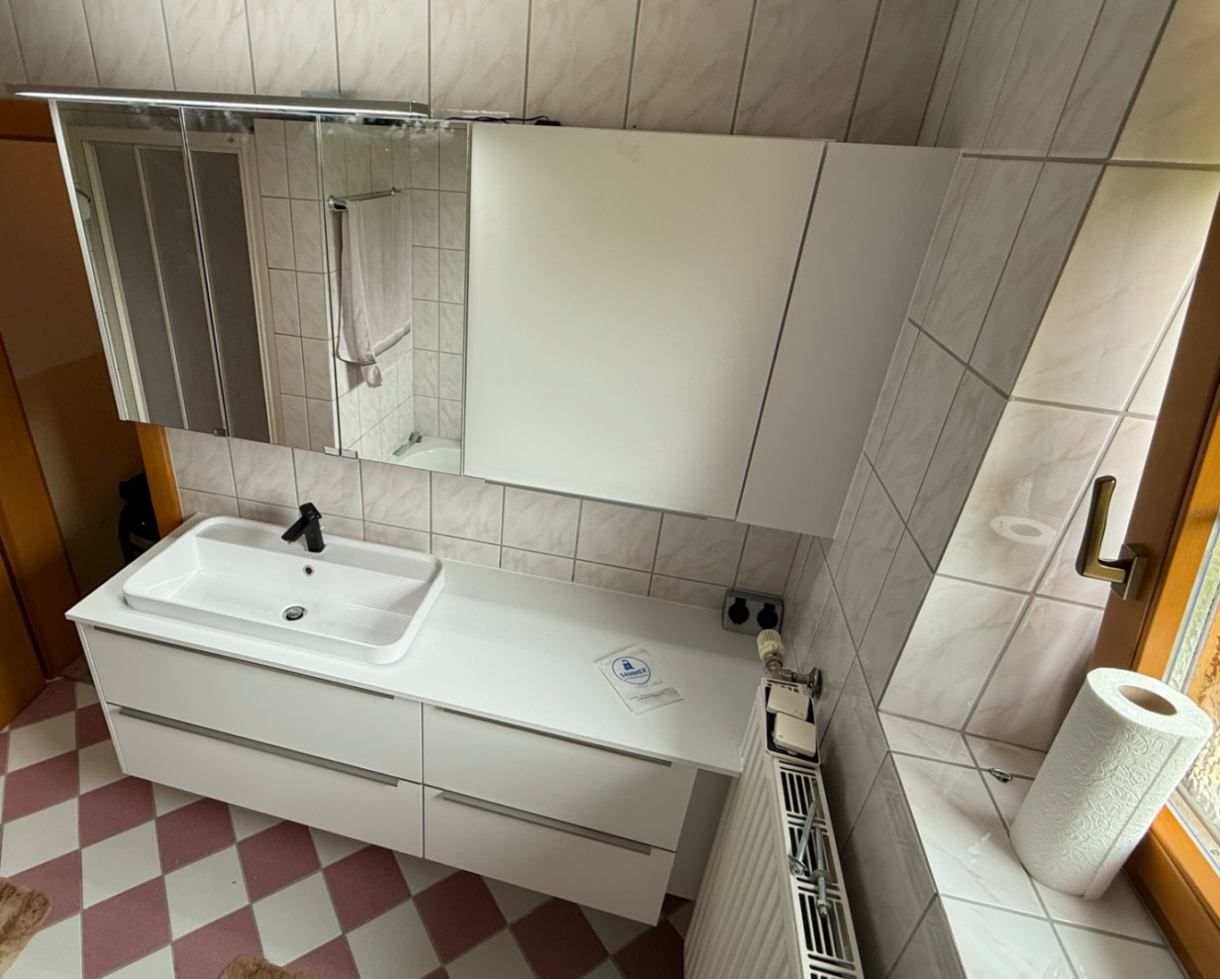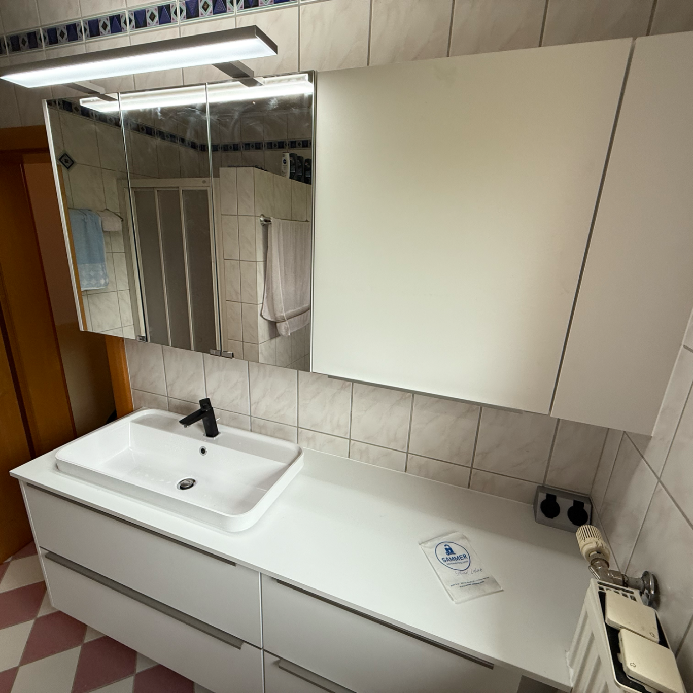 Die Montage umfasste den präzisen Aufbau des Waschtischunterschranks, die passgenaue Installation des Waschtisches sowie die sorgfältige Montage des Spiegelschranks. Alle Elemente wurden exakt ausgerichtet, um eine saubere Optik und eine komfortable Nutzung im Alltag zu gewährleisten.
