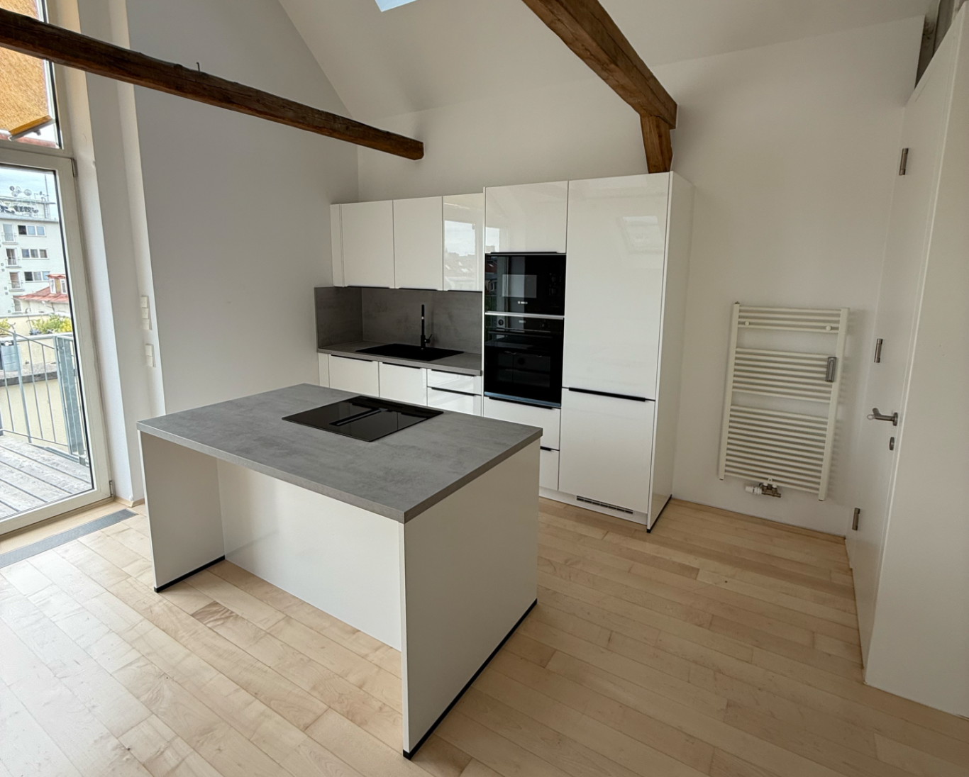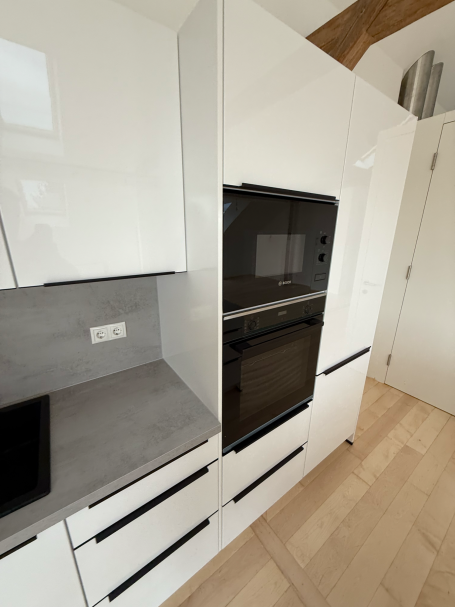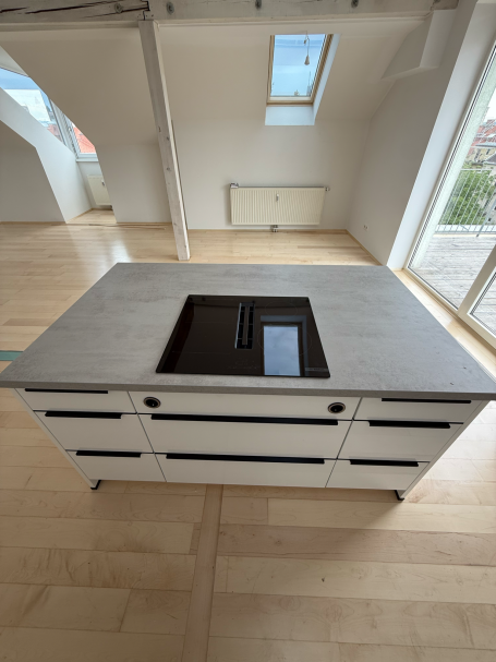 Besonderes Augenmerk lag auf einer sauberen Verarbeitung, gleichmäßigen Fugenbildern und einer harmonischen Integration der Küche in den Raum mit Dachschrägen und sichtbaren Holzbalken. Gerade bei solchen Raumsituationen ist eine fachgerechte Küchenmontage entscheidend, um ein stimmiges und langlebiges Ergebnis zu erzielen.